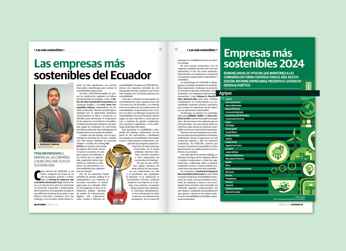 Hemos sido reconocidos entre las 30 empresas más sostenibles de Ecuador en 2024, según el ranking anual de YPSILOM.