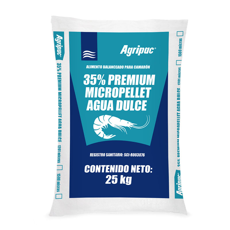 Alimento balanceado 35% Premium Micropellet Agua Dulce, puede suministrarse para camarones adultos y juveniles.
