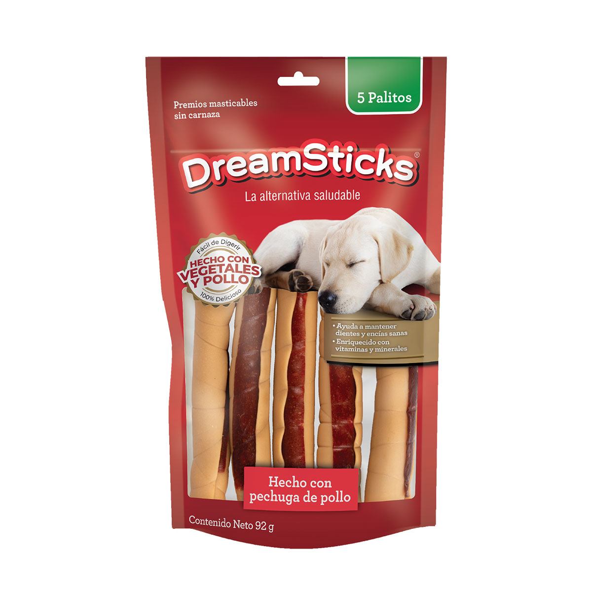 5 piezas. DreamSticks son un premio en forma de palito masticable hecho a base de vegetales y pollo, DreamSticks no contiene carnaza. Fácil de digerir y enriquecido con vitaminas y minerales. Ideal para perros de todos los tamaños que requieren satisfacer la necesidad de mordisquear, además de ayudar en la higiene bucal y mantener sus encías saludables.