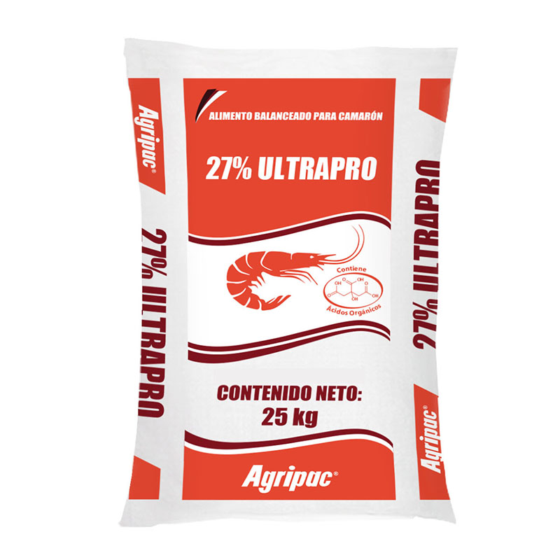 Alimento balanceado 27% Ultra Pro, puede suministrarse para camarones adultos y juveniles.