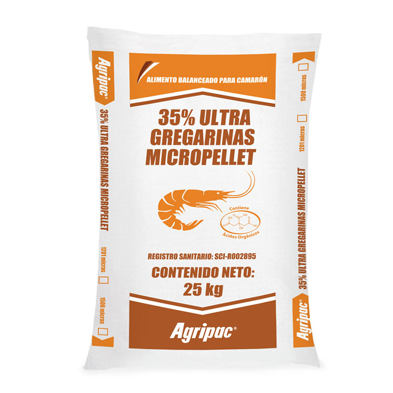 Alimento balanceado 35% Ultra Gregarinas Micropellet, puede suministrarse para camarones
