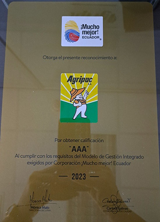 La Corporación Mucho Mejor Ecuador nos ha honrado con un prestigioso reconocimiento por alcanzar la calificación AAA. Este logro representa el resultado de nuestro compromiso con la excelencia y el cumplimiento riguroso de los requisitos del modelo de Gestión Integrado establecidos por la Corporación, de la cual somos socios hace varios años. Este reconocimiento refuerza nuestro compromiso continuo con la calidad y la mejora constante en todos nuestros procesos.